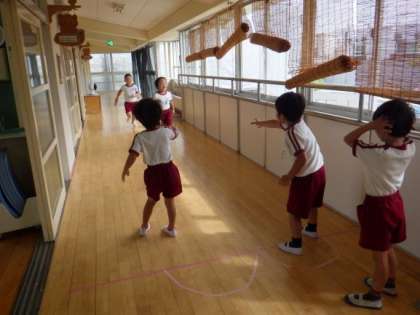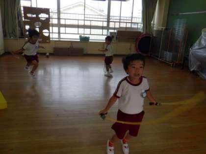 登園して朝の準備が終わるとすぐにそら組の子ども達は「縄跳びする!!」と自分の縄を持って、いろいろな跳び方や回数にチャレンジしています。「綾跳び1回できた!」「13回跳べた!」と自分で目標を決めて頑張っています。朝からリレーもしています。「窓にタッチして帰ってくることな」「人数こっちが少ないで。どうする?」と子どもたちで話し合い遊びを進めています。朝からやる気・元気な子どもたちの姿から、主体的に遊びを楽しみ、諦めずにやり遂げる達成感を味わい、自信をもって取り組む自立心が育っていると感じます。また友達と折り合いを付けながらきまりをつくったり、守ったりして遊ぶ姿も見られ、道徳性・規範意識の芽生えにつながっていると感じています。