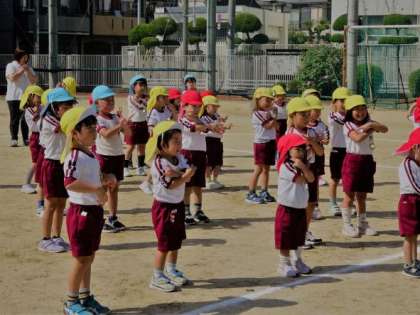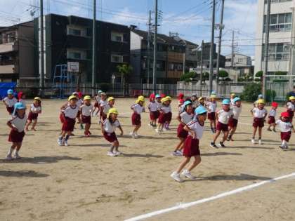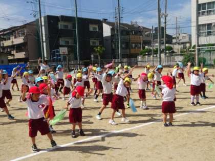 運動会が終わると全て終わりではありません。運動会の遊びは続いています。今日は全員で各クラスのダンスを踊りました。日頃から一緒に遊ぶことが多いので、踊り方を伝えなくても楽しそうに踊る姿がありました。5歳児が使ったリボンも3歳児、4歳児が借りて踊りとてもうれしそうでした。子どもたちの表情から5歳児への憧れがよくわかります。異年齢交流の大切さを改めて実感します。今後も大切に取り組んでいきたいと思います。