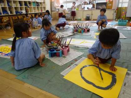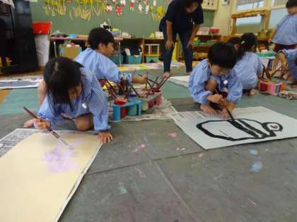 4歳児は昨日行った動物園の絵をかきました。人数も少なくゆっくり見ることができたので子どもたちの印象に残ることも多かったように思います。好きな色、画用紙を選び、体全体を使ってかくことを楽しんでいました。図鑑や写真を見ながらかくのではなく、心で感じたことを表現することが大切だと考えます。同じ絵になることはありません。一人一人の表現をこれからも大切に保育をすすめていきたいと思います。
