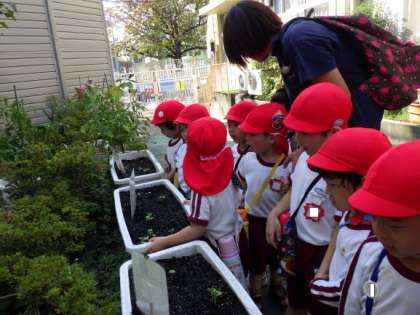園外のグラウンドで遊んだ帰りに、必ず「ダイコン」の生長を確認しています。「ダイコンどうなったかな?」と子どもたちはわくわくどきどき……!