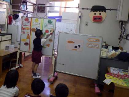 紙芝居を読んだ後、食べ物カードを3色に色分けするクイズをし、バランスの良いお弁当を自分たちで考えてみました。苦手な食べ物も少しずつでも食べるよう挑戦してみてください。