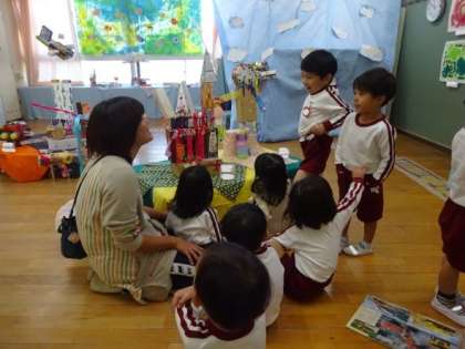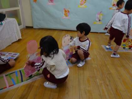 3歳児が自分の作品を飾りました。「ここがいいねん」と言い、友達と並べて嬉しそうです。みんなで作品を見合い拍手をもらうと、満面の笑みでした。同じ素材を使用しても一つも同じ作品はありません。それぞれの違いを認め合える心の育ちを大切にしていきたいと思います。