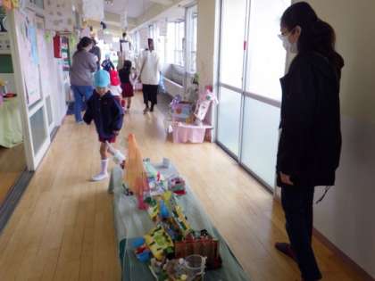 子どもたちがかいた絵やがんばってつくった作品を保育室いっぱいに飾り、作品展をしました。お家の人が見に来てくださり、「こっちだよ!見て」ととても嬉しそうに見てもらっていました。「すごいね!」とたくさん認めの言葉をかけてもらった子どもたちはとても嬉しそうでした。見てもらう喜びを感じ、それがまたつくってみよう、かいてみよう、やってみようという意欲につながっていくと思います。作品展に来ていただきありがとうございました。