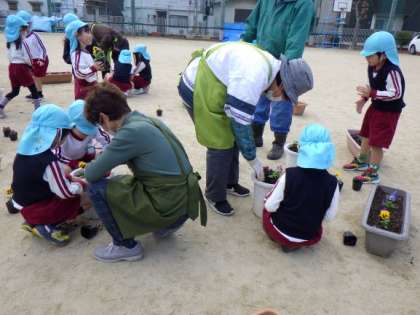 西淀川区役所の方と地域のボランティアの方がそら組にお花のことやお花の植え方を教えに来てくれました。チョキの手で大事に苗を出すことやお布団をかけるように土をかけることなど、分かりやすく教えてもらいました。パンジーとアリッサムの苗を自分たちで2つ選んで植えました。地域の方たちと関わり親しみを感じることができました。これからも地域の方々に支えられていることを実感し大切にしていきたいと思っています。