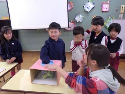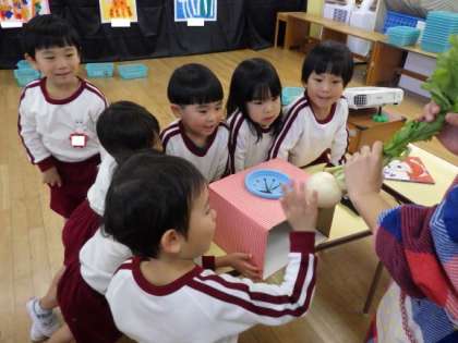 そのあと、野菜当てクイズをしました。箱の中に手を入れて、何の野菜が入っているか感触や形から考えてみました。カブは難しかったみたいで、「ふわふわのところはホウレンソウみたいだけど、丸いところはトマトみたい」「ダイコンかな?」などと話していました。