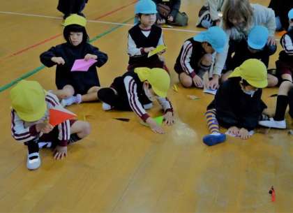 PTA活動で紙飛行機遊びを実施しました。保護者向けの紙飛行機講座の後は、いろいろな飛ぶものを実際につくって遊びました。「すごい!」「もう一回しよう」など子どもたちはとても喜んでいて、楽しい時間となりました。昼からは園内で紙飛行機を飛ばして遊ぶ姿も見られました。子どもたちのためにご準備いただきましてありがとうございました。