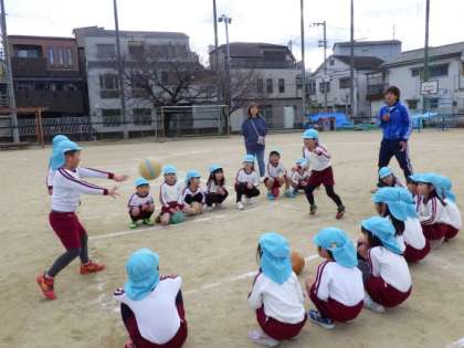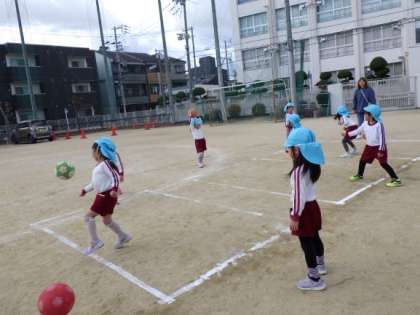 5歳児はグラウンドでドッチボールをして遊んでいます。今日の、のび×のびタイムでそら組はドッチボールでボールをキャッチしたり、投げたり逃げたりするコツや、どうしたら勝てるのか、などを教えてもらいました。最後にはドッチボールの試合をクラスみんなでしました。寒くなってきましたが、これからも楽しんでいろいろな体を動かす遊びをしていきたいと思っています。ボールはとったらすぐ投げるのがコツだそうですよ!