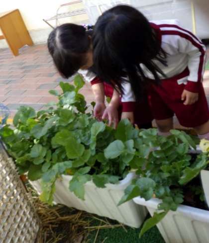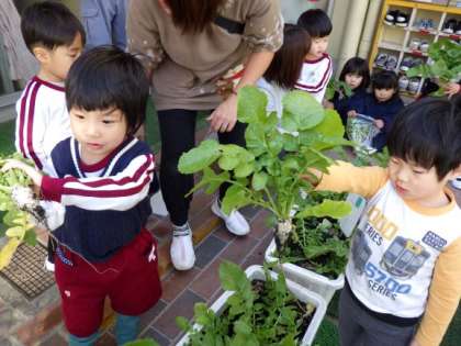 3歳児はな組がダイコンの収穫をしました。種から植えて育てており発芽や葉の生長に関心をもち大切に育ててきました。「もっともっと大きくなってね」「ここが大きくなってる」とダイコンに話かけたり、生長を喜んだりしダイコンへ親しみの気持ちをもって関わってきました。収穫することを知らせると大喜びで、劇遊びで遊んでいる『おおきなかぶ』のお話のイメージから「うんとこしょ、どっこいしょ」と自分で選んだダイコンを収穫しました。「おっきいー!」「みてみて!」と収穫する喜びを感じていました。自然に触れて関わる中で生命の不思議さや命の大切さに気付く活動となりました。
