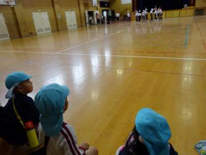 姫島小学校の施設をお借りしていることから、普段の小学校生活にふれる機会が多くあります。講堂では体育の授業でバレーボールをしているところを見たり、廊下を歩いていると小学生が手を振ってくれたりします。行事でのふれあいではありませんが、この日々の積み重ねが就学に向けての期待や安心感につながると感じています。少しでも多くの期待がもてるように保育を進めていきたいと思います。
