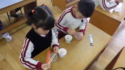 はじめは箸を1本持って動かし、次は2本に増やして、上の箸だけ動かして下の箸は動かさずに上の箸を上下に動かす練習をしました。持ち方を確認したあとは、フェルトボール、ビーズ等を箸でつかんでみました。最初は「難しい」という声が聞こえていましたが、何度も繰り返すことで少しずつ上手になっていました。