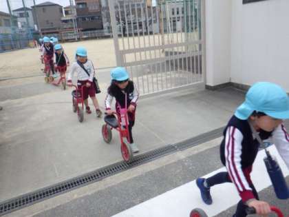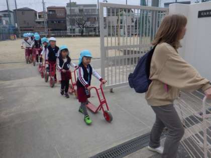 5歳児そら組がグラウンドでドッジボールをしていました。今日は4歳児ほし組の時の担任の先生が一緒に遊んでくれて、子どもたちはとても楽しそうでした。3月からは園庭で遊べる予定になっています。グラウンドからスクーターや三輪車など、そら組がお引越し屋さんをしてくれました。遊ぶ時とは違う、安全に気を付けて真剣に運んでいます。本当に頼りになるそら組です。またお手伝いお願いしますね!!