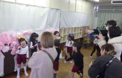 PTA企画委員の保護者の方が、5歳児そら組のためにお別れ会をしてくださいました。保護者と新しい遊戯室で、ダンス、いす取りゲーム、じゃんけん列車をして遊びました。普段自分たちがしている遊びを保護者の方がしていることや、一緒に遊ぶことが子どもたちはとてもとても嬉しかったようです。記念撮影ができる素敵なコーナーもあり、子どもも保護者も笑顔がいっぱいの思い出に残る時間になりました。準備をしてくださった企画委員の皆様本当にありがとうございました。
