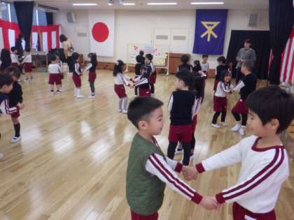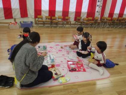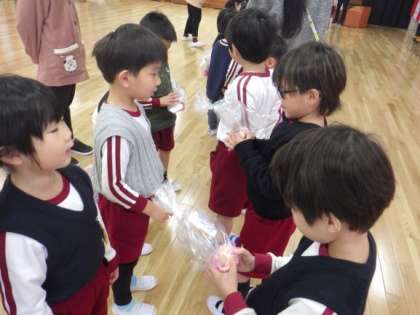 はな組がそら組を誘いに来てくれて、遊戯室の会場をほし組が準備してくれて、そら組のためにおわかれ会をしてくれました。一緒に遊んだり、先生たちのおおきなカブの劇遊びを見たり、とても楽しい時間を過ごせました。かわいい手作りのカード立てのプレゼントもありました。お弁当は全園児、先生たちも一緒に遊戯室で食べました。そら組がしてきたことをはな組やほし組が見ていてくれていて進級への期待につながり、そら組はしてもらう喜びや人の役にたつ喜びを感じていました。