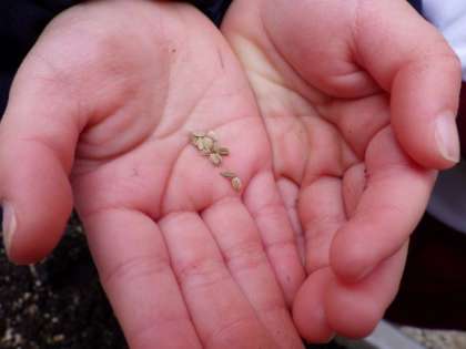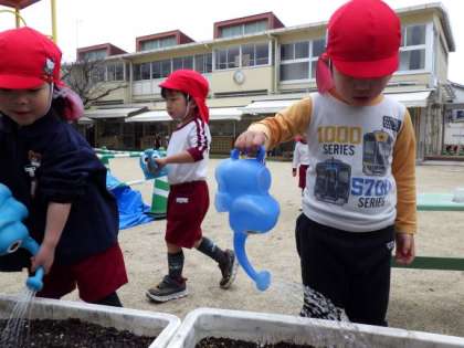 3歳児はな組はニンジンの種をまきました。植える前に種を見たり触れたりすると「チクチクする!」とこの前植えたり見たりしたダイコンやカブの種との違いを感じていました。手で土を掘って種をまくと優しく土をかぶせ、水やりをすると「おおきくなってね」と自然とニンジンに話しかける姿もあり、植物への親しみの気持ちの育ちを感じました。大きなニンジンになるように大切にお世話していこうね。