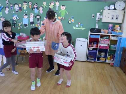 年長児に最後の保健指導として、入園時からどれくらい大きくなったか話し、成長の記録を渡しました。成長の記録とは、入園してから身長と体重がどれだけ増えたのか、各自の成長を記したカードです。成長の記録を見ると自分の成長に驚き、「こんなに大きくなったんだ」と楽しんで見ていました。