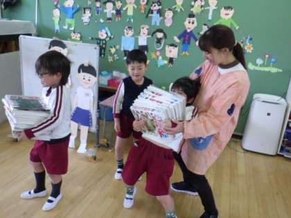 図鑑1冊が約1kgだったため、自分の増えた体重分の図鑑を持ってみました。重くて持つのも大変そうでしたが、嬉しそうで誇らしい姿が見られました。