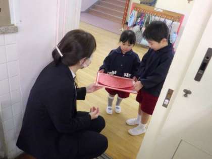 幼稚園の生活を少し紹介します!朝子どもたちが幼稚園に登園してきます。朝の準備をしてみんながそろったところで、お休み調べをします。誰が今日はお休みかな?欠席の友達の名前を先生がお休み調べに書いて、お当番の子どもたちや各クラスで順番に子どもたちが職員室へ持って行きます。「今日のはな組のお休みは・・」1学期は恥ずかしかったり、難しくて困っていたりしていた子どもたちも3学期には元気に自信をもって言ってくれるようになりますよ!この日は園長先生が聞いてくれました。
