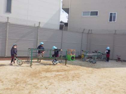 幼稚園では子どもたちが毎日いろいろな場所で遊んでいます。今日は園庭での遊びを紹介します。園庭ではスクーターや三輪車に乗ったり、一輪車の挑戦したりしています。ドッジボールを友達と一緒に相談しながら遊んだり、砂場ではごちそうづくりやお団子づくりを楽しんだりしています。安全に子どもたちが毎日充実感や満足感を味わって遊べるよう環境を考えていきたいと思っています。