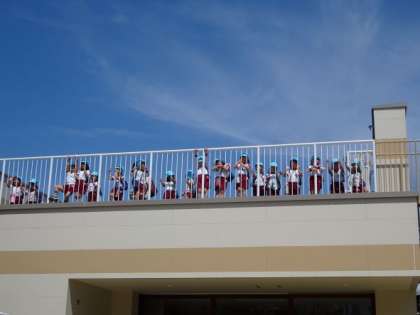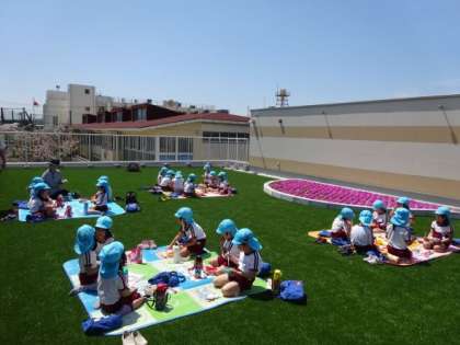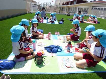 5歳児が屋上でお弁当を食べました。「なんか特別おべんとうやな」と嬉しそうでした。風も気持ちよく、春を感じながら食べることができました。季節や施設をうまく取り入れながら、少しでも多くの楽しさを感じることができるよう、考えていきたいと思います。子どもたちはおうちの皆さんがつくってくださるお弁当を、とても美味しそうに食べていました。いつもありがとうございます。