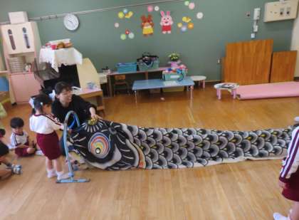 3歳児はな組は室内遊びでこいのぼりの中に入って遊びました。園庭にあがっているこいのぼりを毎日見ていて「泳いでいるの楽しそうだね」と話している子どもたちもいたため、室内遊び用のものを見せると、興味深々でした。初めは、慎重になっていた子どもたちも何度もするうちに楽しくなって長いトンネルをスイスイと進む様子がありました。来週からこいのぼり制作も始まるため、こいのぼりに親しみを持ってみんなで楽しんで作っていこうと思います。