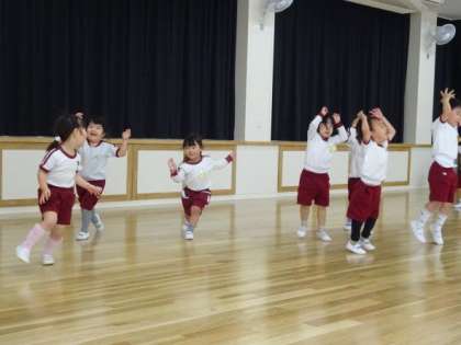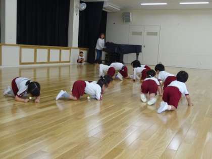 4歳児は遊戯室で体を動かして遊びました。ピアノの音に合わせて走ったり、ウサギやダンゴムシになって遊んだりしました。子どもたちの表現がとても可愛かったです。一人一人の表現を大切にしながら、丁寧に保育をすすめていきたいと思います。