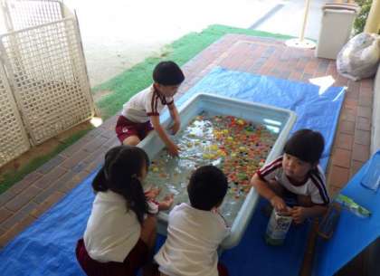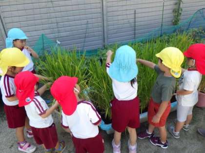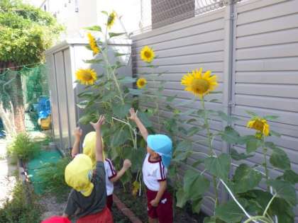 お盆休みが終わり、預かり保育の子ども達が元気に登園してきました。いつものようにテラスで水遊びをしていると「ヒマワリが咲いている!」と子どもが気づきました。水遊びの後、少しだけ園庭をお散歩。「めっちゃ大きい!」「ジャンプしたら届きそう!」と目の前の大きなヒマワリに驚いていました。また、夏休み前から育てていた稲に穂が付いてる事に気づきました。「これお米になるの?」と穂を触りながら不思議がる3歳児もいました。子ども達は、実際に植物に触れ、生長を目の当たりにする事ができました。