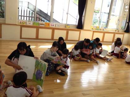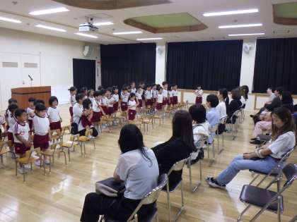 夏休み明けの子どもたちが元気に登園しました。夏休みも楽しく過ごせたようで嬉しく思いました。始業式後は「ふれあい絵本タイム」をしました。保護者の皆さんに読み聞かせをしてもらっている姿は、とても微笑ましく素敵な時間が流れていました。ご協力いただきましてありがとうございました。