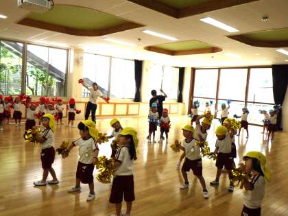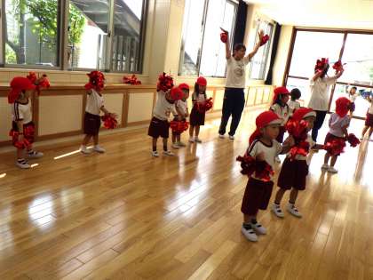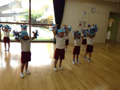 曲に合わせて踊りました。キラキラポンポンが嬉しくて手をキラキラさせたり、友達と見せ合ったりする姿がありました。異年齢で遊ぶのも楽しいようです。子どもたちの「うれしい」「やってみたい」を大切に取り組んでいきたいと思います。