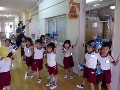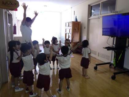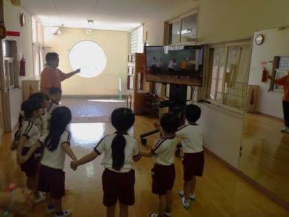 職員が体操やダンスを踊った動画を撮影し、子どもたちが好きな遊びの時間に見たり真似たりして遊べるように環境を整えました。早速クラスの友達と一緒に遊びに行くと・・・「〇〇先生や!」と喜んで見たり真似て遊んだりしていました。異年齢の友達とも関わりながらリズムを感じたり体を動かしたりして遊ぶ楽しさを感じていけるようこれからも保育を進めていきたいと思います。