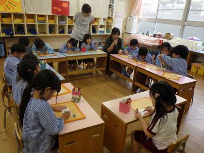 4歳児が運動会で遊んでいる絵をかきました。それぞれの楽しんでいることや、見てほしいことを想い、丁寧にかいていました。どれも素敵な絵で、話を聞くとより想いも伝わってきました。保護者の方にもみていただきますので、楽しみにしていてください。