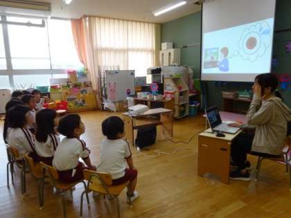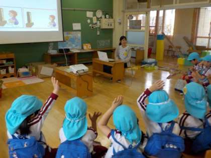 目について保健指導をしました。目を大切にする方法を2つ知らせました。画面からは「前をならえ3人分」くらい離れて見ること、見る時間はおうちの人と相談して決めることを知らせました。