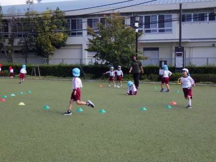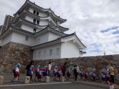 尼崎城に園外保育へでかけました。5歳児が3歳児の手をつなぎ、4歳児は自分たちで歩きました。お城が近づくと「大きいなあ」「石(石垣)は落ちてこないの?」と感じたことを話す姿がありました。自分の目で見て触ることで、知らないことに気付くことができた園外保育となりました。