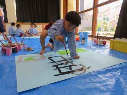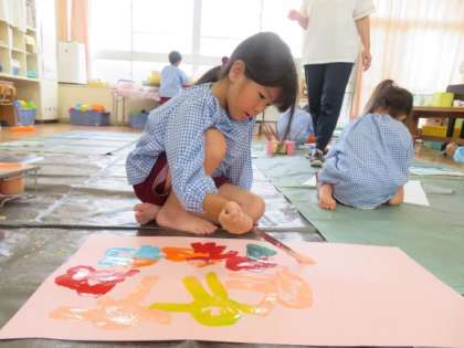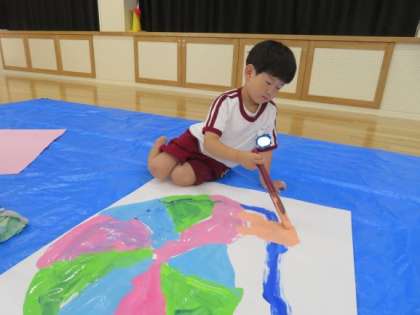運動会で経験したことや、遠足での楽しかった思い出を絵にかいています。大きな紙に絵の具で丁寧に線をかき、一人ひとりの個性が光る絵ができていきます。完成すると絵のお話や思いをたくさん聞かせてくれます。経験を通して感じたことをのびのびと表現する楽しさや喜びを味わえるよう環境を整えていきたいと思います。