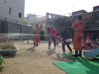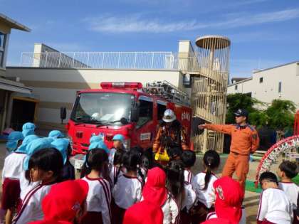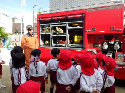 西淀川消防署と連携し、消防訓練を行いました。始めに、火災を想定した避難訓練を行い、訓練の様子を見ていただきました。消防士さんから非常ベルや放送の音を聞いて、あわてずに園庭に避難できたことを褒めていただきました。職員向けには通報訓練や、水消火器を使った消火訓練も行いました。最後に消防車を見学させていただき、車についているボタンや機材について教えてもらえて嬉しそうな子どもたちでした。