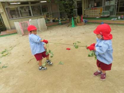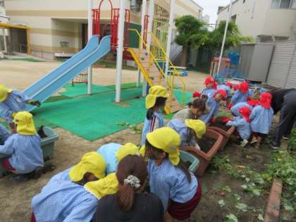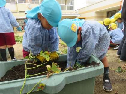 幼稚園のプランターで育てたサツマイモの収穫をしました。猛暑だったのでおいもが育っているか心配していましたが、ツルを引っ張ったり、手で土を深く掘ったりすると、形も大きさも様々なおいもが出てきて大喜びの子どもたちでした。芋ほりの後は、おいものツルで引っ張りっこをして遊びました。普段なかなかできない体験も機会を逃さずに大切にしていきたいと思います。