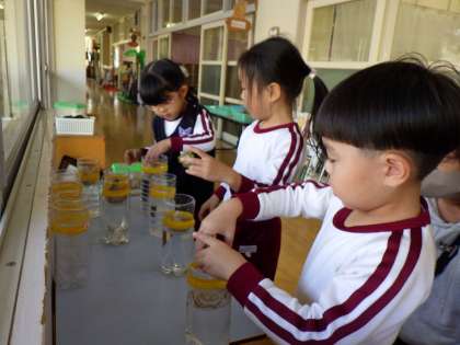 どんな花が咲くかなあ 公開日 2025/11/18 更新日 2025/11/18 保育の様子 4歳児がヒヤシンスの水耕栽培をしました。「おしりにお水つけるの?」「えーっ!」と驚きながらも、喜んで取り組んでいました。種、苗、球根など、いろいろな種類があります。実体験を通して、花の成長を楽しみにしていきたいと思います。 いいね(0)