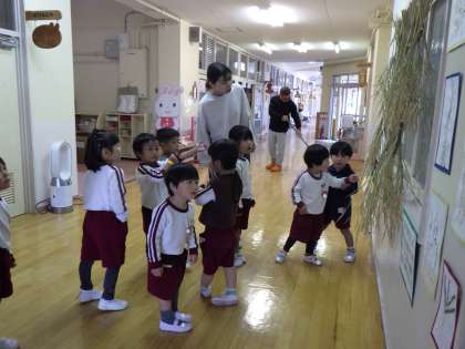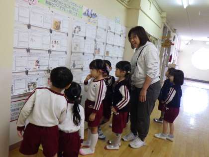 3歳児と4歳児が、園内に飾ってある作品を見て回りました。「ここにあった」と、自分の作品を見つけて教えてくれました。友達の作品もじっと見ていました。作品は一つ一つ違い、それぞれの感性が素敵です。どうぞ明日を楽しみに、幼稚園にお越しください。