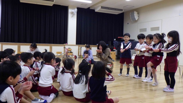 誕生会をしました。5歳児が簡単なクイズ遊びを教えてくれたり、みんなでダンスをしたりして遊びました。友達に祝ってもらうことや、祝うことを通して、一人一人が大切な存在であることを感じることができるように、取り組みや声のかけ方を工夫していきたいと思います。