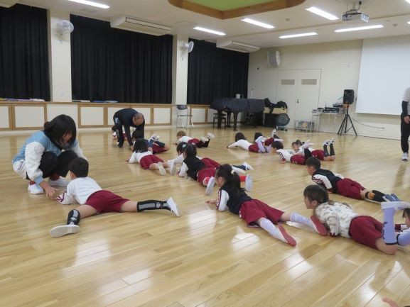 外部講師の方に来ていただき、体を動かして一緒に遊びました。「早寝・早起き」「朝ごはんは大切」「外で元気に遊ぼう」の生活習慣の紙芝居動画は、冬休み明けの子どもたちにぴったりの内容でした。講師の先生と一緒に元気いっぱい体操したり、クマやワニなどの動物のまねをして体幹を鍛えることができる運動遊びを教えていただいたりと、楽しい時間となりました。3学期の保育にも取り入れていきたいと思います。
