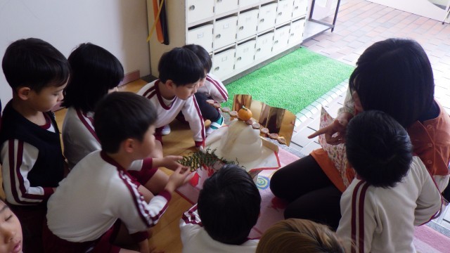 1月15日は鏡開きです。幼稚園で飾っている鏡餅を見て先生から鏡開きやお飾りのお話を聞きました。