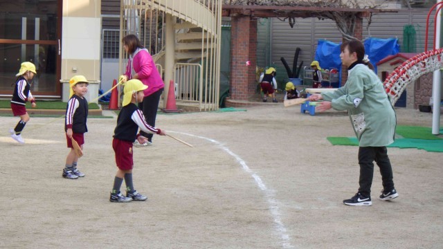 4歳児が羽根つきを楽しんでいます。羽をつくことが難しいのですが、何度も挑戦し続けています。羽のつく音もうれしいようです。日本の伝統遊びに触れる機会をもち、継承していく大切さを感じています。いろいろな遊びを取り入れながら、子どもの「やった」「できた」を増やしていけたらと思います。