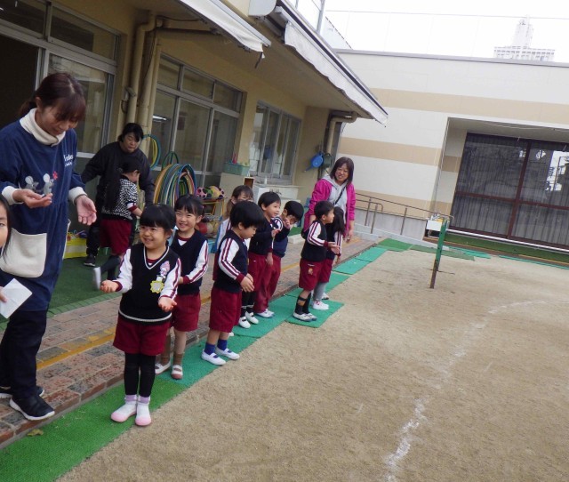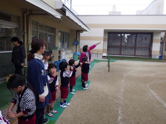 雪を見つけた4歳児が外に出ると「わあー。雪や」と喜んでいました。頭や手についた雪を触り「冷たいな」と話す姿がありました。大阪は雪が降ることも少なく、子どもたちも雪を見たり触わったりする経験がありません。幼稚園ではタイミングを逃さず、自然現象にふれる機会を大事にしたいと思います。