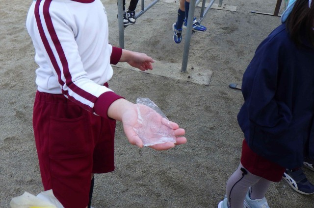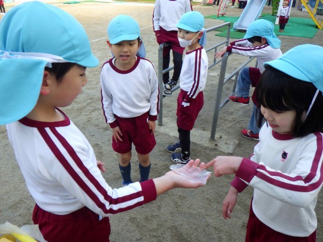 5歳児が園庭で遊んでいるときに、氷を見つけました。「見つけた!冷たい」「昨日雪降ったもん」と話していました。その後どうするのかを見ていると「この氷どうなるか見たい」と言い、バケツに入れていました。遊び終えた後、「見て。溶けてきた」と発見したことを、みんなで共有する時間をもつことができました。自然現象にふれ、不思議に思ったり、発見を喜んだりする体験を通して、身近な事象に関心をもつ機会になりました。「また雪降ってほしい」と期待していました。