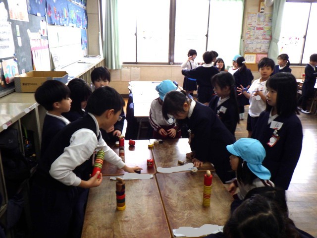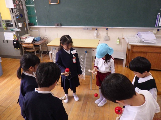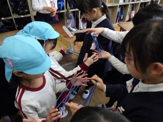 5歳児と姫島小学校の1年生の交流をしました。4月から小学生になる子どもたちは、小学校の机、チャイムなど全てに興味をもち、交流時間を楽しんでいました。1年生が昔遊びを教えてくれましたが、とても優しく接してくれました。早く小学生になりたい気持ちも強くなったように感じます。姫島幼稚園の強みである幼小連携をさらに深めることで、子どもも保護者も安心して就学できるようにしていきます。