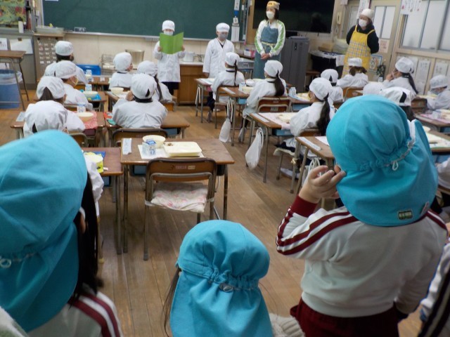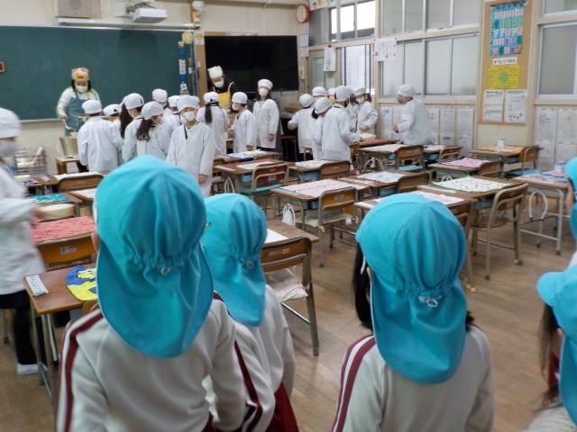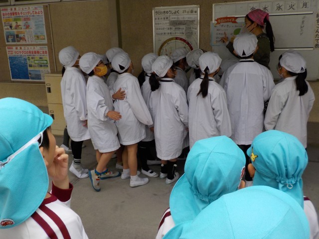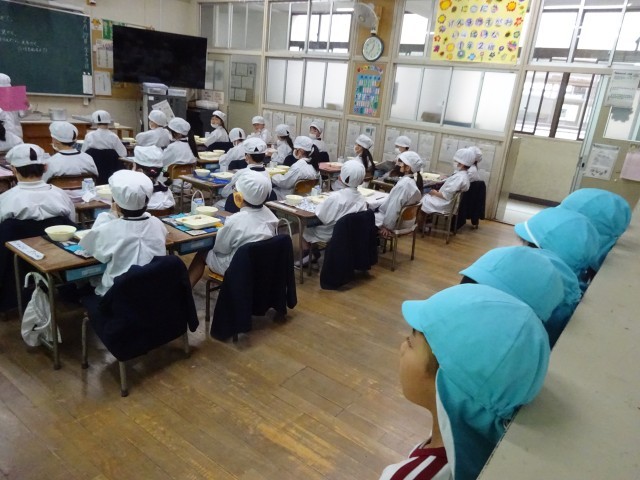 1年生の教室で、配膳や食事の様子を見せていただきました。