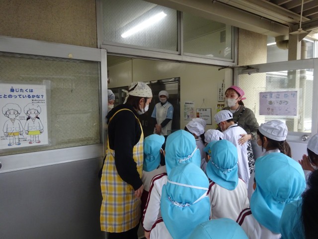 給食室から食缶を運ぶところから見学させていただき、興味津々で見ていました。