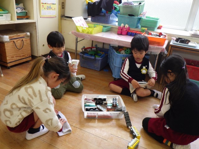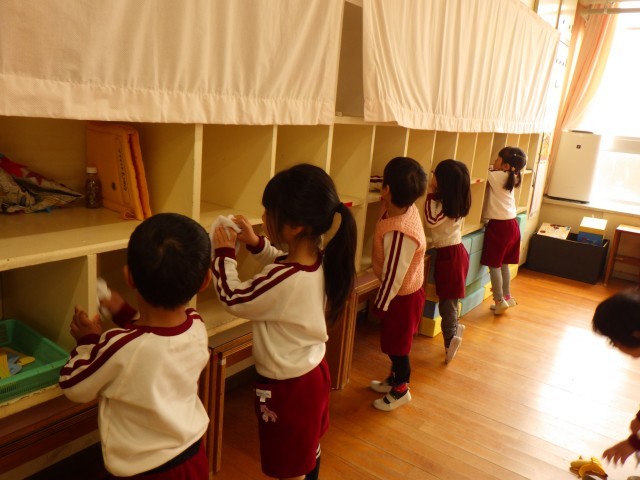 3、4歳児が保育室の掃除をしました。1年間使ってきたロッカーやおもちゃを丁寧に拭いていました。「ありがとう」と言いながら拭く姿があり、見ていて嬉しく思いました。施設や遊具を大切に使うことで、次の学年の友達が気持ちよく使えるように知らせていきたいと思います。