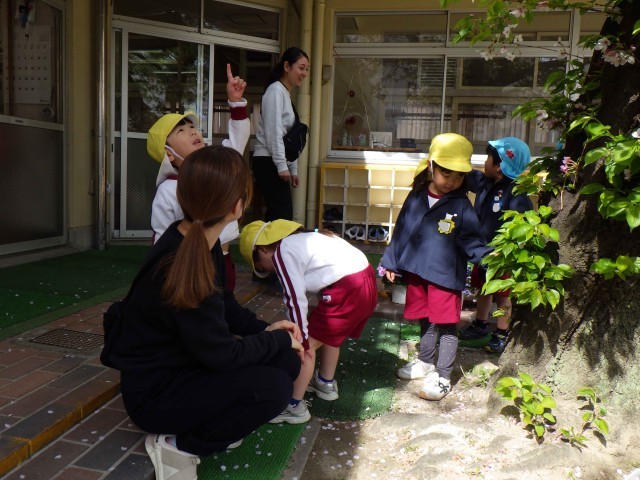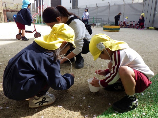 幼稚園では桜の花びらを集めたり、花を使ってご馳走をつくって遊んだりしました。春の季節だからこそ楽しむことができる遊びを取り入れながら、子どもたちにとっての大好きな遊びを一緒に見つけていきたいと思います。