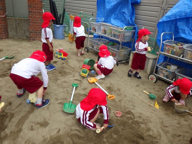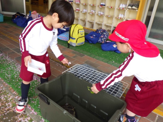 新入園児の3歳児が元気に登園し、園庭で遊びました。砂場で山をつくったり、カメにサクラの花や葉を見せてあげたりしていました。幼稚園は楽しいと感じられるよう、明日からもたくさん遊びたいと思います。好きな遊びをたくさん見つけてほしいと思います。