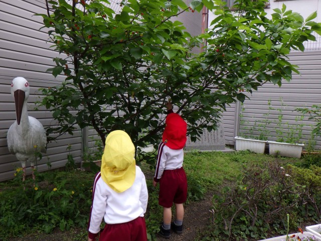 子どもたちが木の上を見上げていました。「赤い」「サクランボや」と話していました。このサクラの木は本園が90周年の時に植樹していただいたもので、8年が経ちました。毎年たくさんの実をつけ、子どもたちが遊びの中で、季節を感じることができる大切な環境の一部となっています。遊びを通してたくさんの学びへとつなげていきたいです。
